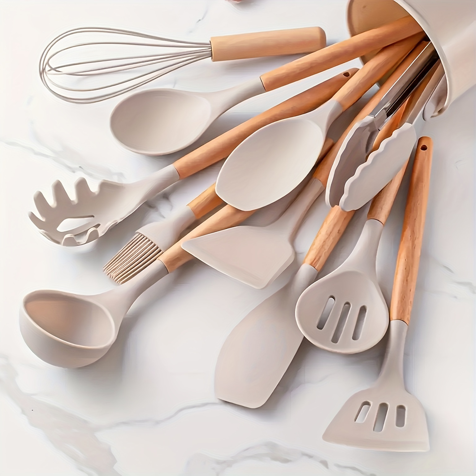 1 x Eiertrenner und 1 x Halter. cocosity Kochbesteck-Set 10er-Set hitzebeständige Küchenwerkzeuge mit Holzgriff (10 Stück), Silikon Kochutensilien Set, Antihaft, Holzgriff 【Lebensmittelqualität Silikon & BPA Frei】 Silikon Küchenhelfer Set besteht aus hochwertigem lebensmittelechtem Silikon, BPA-frei. 16-teiliges Kochutensilien-Set: Ein Set mit 16 Küchenutensilien kann alle Kochbedürfnisse erfüllen. Hitzebeständig, Holzgriff, nicht schmelzend: Das Kochutensilien-Set kann Temperaturen von bis zu 230 °C standhalten, Sie müssen sich keine Sorgen machen, dass es schmelzen und Rauch erzeugt, selbst bei hohen Temperaturen braten. 🎁🎁Ein Set von 16 Küchenutensilien kann alle Kochbedürfniss... Leicht zu reinigen: Für immer wie neu. KUNDENGARANTIE: Wenn Sie Fragen zu diesem Paket haben, können Sie sich gerne an unseren Kundenservice wenden und wir stehen Ihnen immer zur Verfügung. Mehrere Farben zur Auswahl und bequemer Griff., Rutschfester, perforierter Silikongriff. 1 x Spatel und 1 x Schlitzwender. Sie und Ihre Familie können sie beruhigt verwenden., Multifunktionaler Silikon-Spatel. Intimes Design und leicht zu reinigen: Edelstahl ist in jedes Silikon-Kochgeschirr eingewickelt, um seine Form und Flexibilität zu erhalten, die Haltbarkeit und Robustheit zu erhöhen, zu verhindern, dass sich der Spatel verbiegt oder verformt. Verbesserter Utensilienhalter für einfache Aufbewahrung. Um die Lebensdauer des Holzes besser zu verlängern, wird empfohlen, es von Hand zu waschen. Hinweise: Es wird empfohlen, vor dem ersten Gebrauch eine halbe Stunde einzuweichen und dann etwa 3 Stunden lang der Luft auszusetzen, der ursprüngliche Geruch von Kieselgel wird verschwinden. Sie müssen sich keine Sorgen machen, dass es die Gesundheit Ihrer Familie beeinträchtigt. Hohe Temperaturbeständigkeit bis 230 °C., Antihaft-Silikon-Kochgeschirr., Komfortabler Griff. Verwenden Sie nach jedem Gebrauch ein weiches Tuch, Sie können überschüssige Lebensmittel leicht reinigen. 1 x massiver Pfannenwender und 1 x Löffelspatel. Küchenhelfer Set Silikon-Küchenutensilien-Set, 9-teiliges Küchenutensilien-Set Mit Holzgriff Für Antihaftbeschichtetes Kochgeschirr, 230 °C, Hitzebeständiges Silikon -Küchenhelfer-Set Mit Großem Halter (Khaki Kochlöffel Set Inklusive solidem Löffel, Schlitzlöffel, Spatel, Nudelheber, Schlitzwender, tiefer Suppenkelle, geschlitzter Spatel, massiver Pfannenwender, runder Spatel, Bürste, Schneebesen, Küchenzange, flexibler Spatel, kleiner Sputula, Eiertrenner und Halter 【Hitzebeständiger, Holzgriff, nicht schmelzend】 Das Kochutensilien-Set hält Temperaturen bis zu 230., 0 °C stand, Sie müssen sich keine Sorgen machen, dass es schmelzen und Rauch auch beim Hochtemperaturbraten erzeugt. Ob Sie kochen, backen, brauen oder mischen, alles, was Sie in der Küche tun möchten, können Sie mit AIKKIL tun. 16-teiliges Küchenutensilien-Set und 16 unabhängige Funktionen. 1 x Spachtel und 1 x großer Spatel. Wir haben uns verpflichtet, unseren Kunden Küchenutensilien von höchster Qualität zu bieten. Die Griffoberfläche des Spatels ist glatt, angenehm zu halten und nicht leicht zu erhitzen, so dass Sie eine angenehme Kochzeit genießen und Ihre Hände besser vor Verbrennungen schützen können Hinweis: Nicht für die Reinigung in der Spülmaschine geeignet Ein Set von 16 Küchenutensilien kann alle Kochbedürfnisse erfüllen, dieses Kochgeschirr-Set hat alles, was Sie brauchen und ist ein großer Helfer beim Kochen