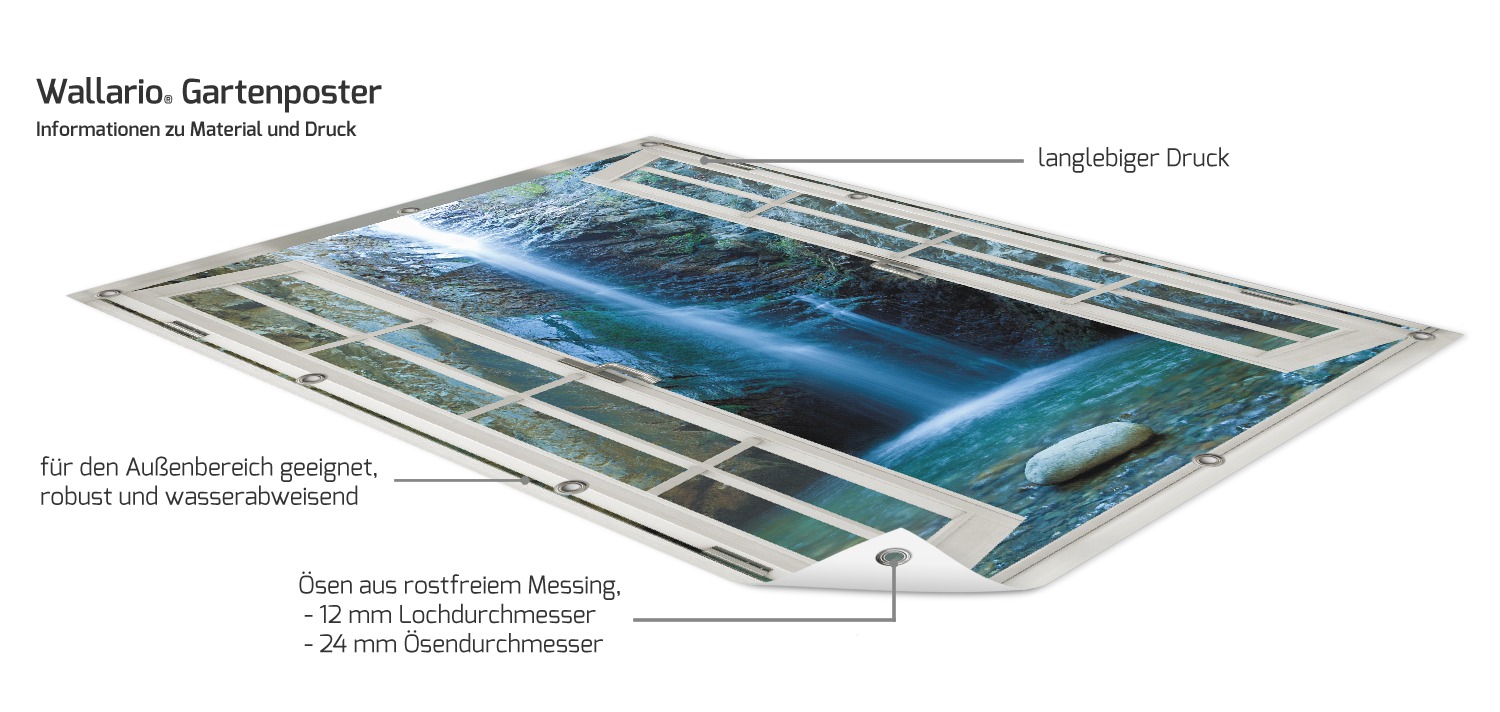 Perfekt als Verschönerung für Sichtschutzelemente und Zäune Ihr Gartenposter ist bereits mit rostfreien Metallösen zum Aufhängen versehen. Im See liegt ein Kieselstein. Wallaro Duschrückwand Wasserfall be Sonnenenfall, (1-tlg Sie erhalten dieses Poster für den Außenbereich in höchster Druckqualität. Kann sofort aufgehängt werden - hochwertige Ösen aus rostfreiem Metall sind bereits vormontiert (10 Stück gesamt, Innendurchmesser: 12 mm) Sie hätten das Motiv lieber gedreht, gespiegelt, in schwarz-weiß oder einer anderen Farbe? Oder möchten Sie Ihren Garten lieber mit Ihrem persönlichen Lieblingsfoto dekorieren? Gerne fertigen wir auch Ihnen auch Ihr individuelles Wunschprodukt an (gegen Aufpreis). 50 cm), Qualität Made in Germany - Auf Anfrage sind auch Sonderanfertigungen möglich Helligkeitsunterschiede zur abgebildeten Grafik sind aufgrund unterschiedlicher Bildschirmeinstellungen möglich - Es ist kein Rahmen enthalten. Wallario Outdoor-Poster Für Garten Oder Balkon Sonnenboot In Der Das Motiv wird auf robustes Kunststoffmaterial gedruckt, die verwendeten Farben sind witterungsbeständig und überzeugen durch ihre Brillanz. Poster mit Fenster-Illusion Wanderweg im Schnee Der Artikel wird in einem Stück geliefert. Poster für den Außenbereich - hohe UV- und Witterungsbeständigkeit - mit aufgedrucktem Fensterrahmen In den tiefen einer Schlucht erblickt man oben einen Lichtstreif am Horizont. Hinweise: - Leichte Farbabweichungen bzw. Poster für den Außenbereich - hohe UV- und Witterungsbeständigkeit - mit aufgedrucktem Fensterrahmen Kann sofort aufgehängt werden - hochwertige Ösen aus rostfreiem Metall sind bereits vormontiert