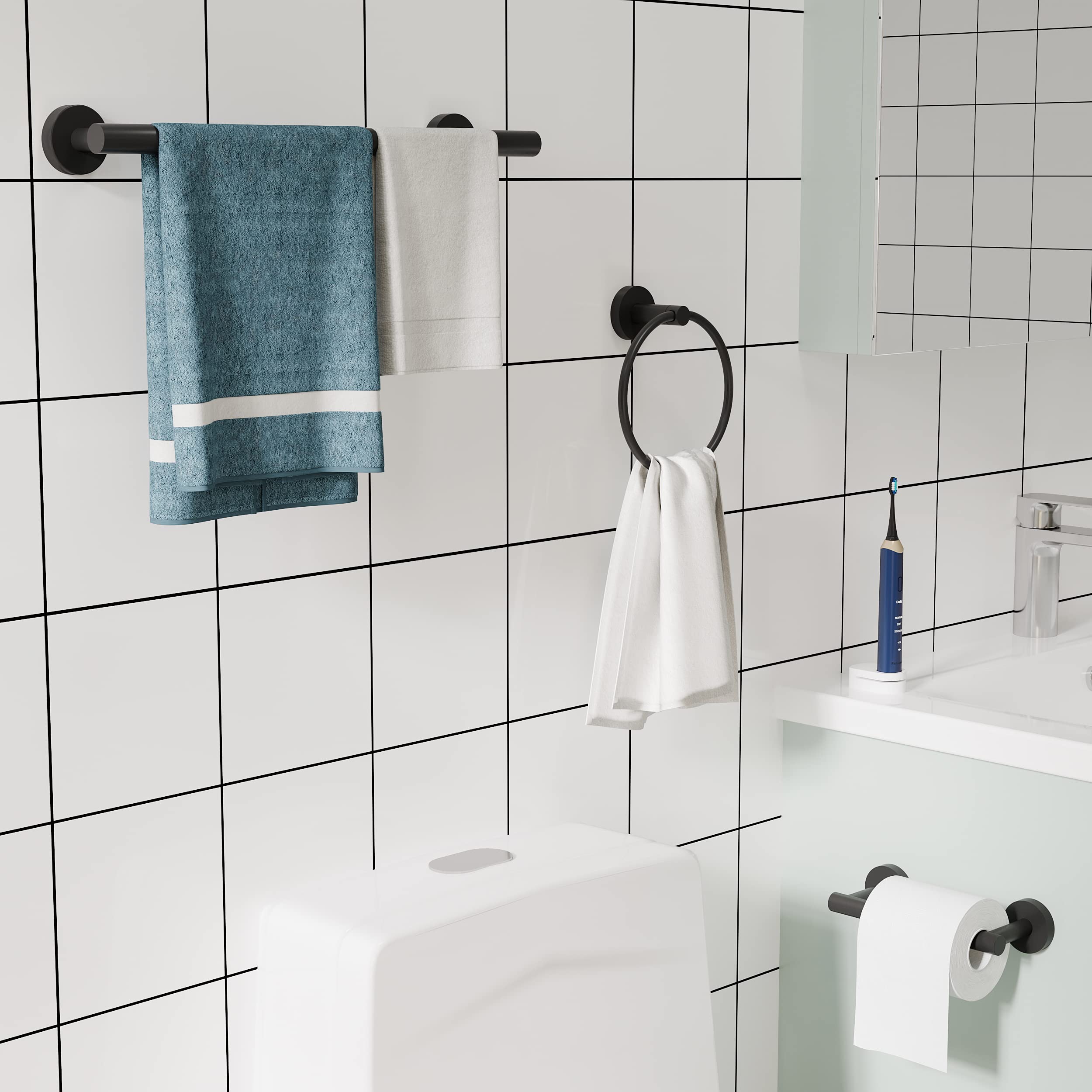 Sobald der Handtuchring Taschentuchhalter installiert ist, bieten die Halterung und die Stellschrauben einen festen Halt, um ihn an Ort und Stelle zu halten. 【Langlebig】Langlebig und rostfrei. Der Toilettenpapierrollenhalter passt auf große Rollen und bietet Platz für große Toilettenpapierrollen. Handtuchstange & Handtuchhalter (runder Ring) & Haken & Toilettenpapierhalter, für Badezimmer, Wandmontage Schwarz zum niedrigsten Preis, 2-Tage-Lieferung, 30-Tage-Rückgabe. Farbe. Mattes Schwarz · Material. Edelstahl · Oberflächentyp. Gemalt · Marke. KWQKEM · Installationstyp. Einschraubbar · Hersteller. Longgaoshop Einfach zu ersetzen: Das drehbare Papierhandtuchstangen-Design des beweglichen Doppelsäulen-Papierhandtuchhalters macht es einfacher und einfacher, Ihre Papierhandtücher zu wechseln, heben Sie einfach die Stange an, um die alte zu entfernen und legen Sie die neue ein, keine Sorge, die Feder zu verlieren, mit dem traditionellen Federdesign. Die kompakte Größe hilft, den Stauraum für Ihre Arbeitsplatte, Ihr halbes Bad und Ihre Küche zu maximieren. Unsere 40,6 cm große Handtuchstange, Handtuchring und Toilettenpapierhalter sind aus hochwertigem 304 Edelstahl. Glatte Kanten und hochwertige Oberflächen. Genießen Sie eine stilvolle und wartungsfreie Nutzung. 3-teiliges Badzubehörset Mattschwarz Edelstahl Wandmontage Inklusive Vorlage und Anleitung. RARXTR Toilettenpapierhalter & Handtuchring & Handtuchstange SUS304 Edelstahl 3-teiliges Badezimmer-Hardware-Set mit Toilettenpapierrollenhalter Wandhalterung & Badezimmer-Handtuchhalter & Handtuchhalter & Handtuchhalter Set1 Die Beschichtung sorgt für Beständigkeit gegen tägliche Kratzer und Abnutzung. Unsere 40,6 cm große Handtuchstange, Handtuchring und Toilettenpapierhalter sind aus hochwertigem 304 Edelstahl. Das ideale Material für feuchte Umgebungen. Dieser Toilettenpapierhalter für das Badezimmer ist langlebig und das rostfreie Design sorgt dafür, dass Ihr Toilettenpapier sauber und hygienisch bleibt by Amazon 3-teiliges schwarzes Badezimmer-Zubehör-Set, Handtuchhalter