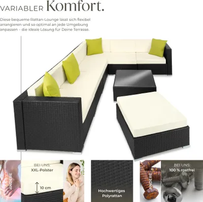 Glasplatten , Aluminiumgestell (100% ROSTFREI / keine Rostflecken auf Ihrer Terrasse wie bei Billigmöbeln mit Stahlgestell 180x88x84 cm(LxBxH) · Sessel: ca. · hoher Sitzkomfort dank besonders dicken und festen Polstern mit 14cm sind diese dicker als bei vergleichbaren angeboten · 8 abnehmbare Rück- und Sitzkissen mit waschbaren und flüssigkeitsabweisenden Bezügen mit Reißverschluss Maße: · Tisch: ca. NORDLAND Gartenmöbel Set Polyrattan 5 Personen inkl. · wetterfest und UV-beständig · das Polyrattangeflecht wird in echter Handarbeit gefertigt! KEINE Bausatzmöbel die zusammen gepuzzelt werden müssen und dann nach kurzer Zeit wackeln / HIER sind alle Teile aufwendig aus einem Stück geschweißt. Beschreibung: · elegantes, zeitloses Design, Echtes XXL Maß · Gestell aus leichtem, extrem-stabilen Aluminium, 100% rostfrei = KEINE Rostflecken auf Ihrem Boden wie bei Möbeln mit Stahlrohrrahmen die von innen durchrosten · NORDLAND Gartenmöbel werden aus Polyrattan gefertigt, welches aufgrund seiner sehr hohen UV- und Witterungsbeständigkeit das ideale Material für Möbel im Außenbereich ist! Große Auswahl Polyrattanmöbel jetzt auf kaufen. Entdecken Sie exklusive Gartenmöbel aus Polyrattan, wetterfest und pflegeleicht Mucola Gartenlounge-Set »Polyrattan Lounge Grau Blau Sofa Tisch Sessel Gartenmoebel Rattanmoebel Gartenset Sitzgruppe Modern Tisch Set Balkonmoebel Balkon Glas Moebel Essgruppe 5 Tlg Premium Gartenlounge Mit Bequemer Polsterung S0s1q0rn 130x66x42 cm (LxBxH) · Sofa: ca. Viel Spaß beim Shoppen und Stöbern! ✅ Polyrattan & Rattan Gartenmöbel-Sets jetzt online kaufen autolock Gartenlounge-Set Gartenmöbel-Set mt Rahmen aus verznkter...