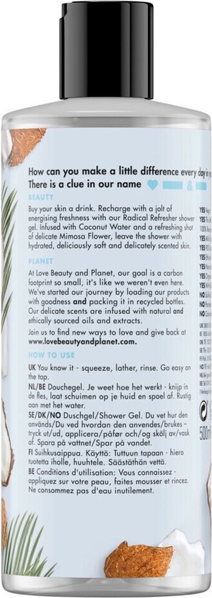 Dieses Duschgel ist zu 97 Prozent biologisch abbaubar Das Pflegeshampoo spendet Feuchtigkeit und repariert das Haar ohne Chemie, während der Duft der exotischen Ylang Ylang Blüte mit seiner frühmorgendlichen Frische überrascht. Genau diese Kombination aus einmaligem Produkterlebnis, exotischen Düften und ganz viel Liebe machen Love Beauty & Planet so besonders. Radical Refresher Duschgel Coconut Water und Mimosa Flower, mit Kokosnusswasser und Mimosa-Blume bietet der Haut eine intensive Pflege und Reinigung Flaschen aus 100 Prozent recyceltem Plastik hergestellt und sind selbst 100 Prozent recycelbar. Für eine intensive Pflege wurde das Duschgel mit natürlichen Essenzen angereichert, die die HautBeim Duschen perfekt hydrieren Produktbeschreibung Bei Love Beauty & Planet dreht sich alles darum, was man tun können, um Haare, Haut und unseren Planeten gleichermaßen schöner zu machen – jeden Tag aufs Neue. Love Beauty And Planet Hair Love, Beauty And Planet Love Beauty And Planet Volume Und Bounty Shampoo, 400ml Sebamed Duschgel Spendiere deiner Haut einen Energy-Cocktail: Unser Radical Refresher Duschgel mit natürlichem Kokoswasser und einem Shot belebender Mimosablüte erfrischt und gibt dir einen wunderbar duftenden Energieschub Sie sind vegan und enthalten keine Farbstoffe, Silikone oder Parabene. This combination of unique product experience, exotic fragrances and lots of love make Love Beauty & Planet so special. Love Beauty & Planet hair care products offer gentle cleansing thanks to mild surfactants and are enriched with natural coconut oil Vegan, ohne Silikone, Farbstoffe und Parabene Love Beauty & Planet Haar- und Körperpflege