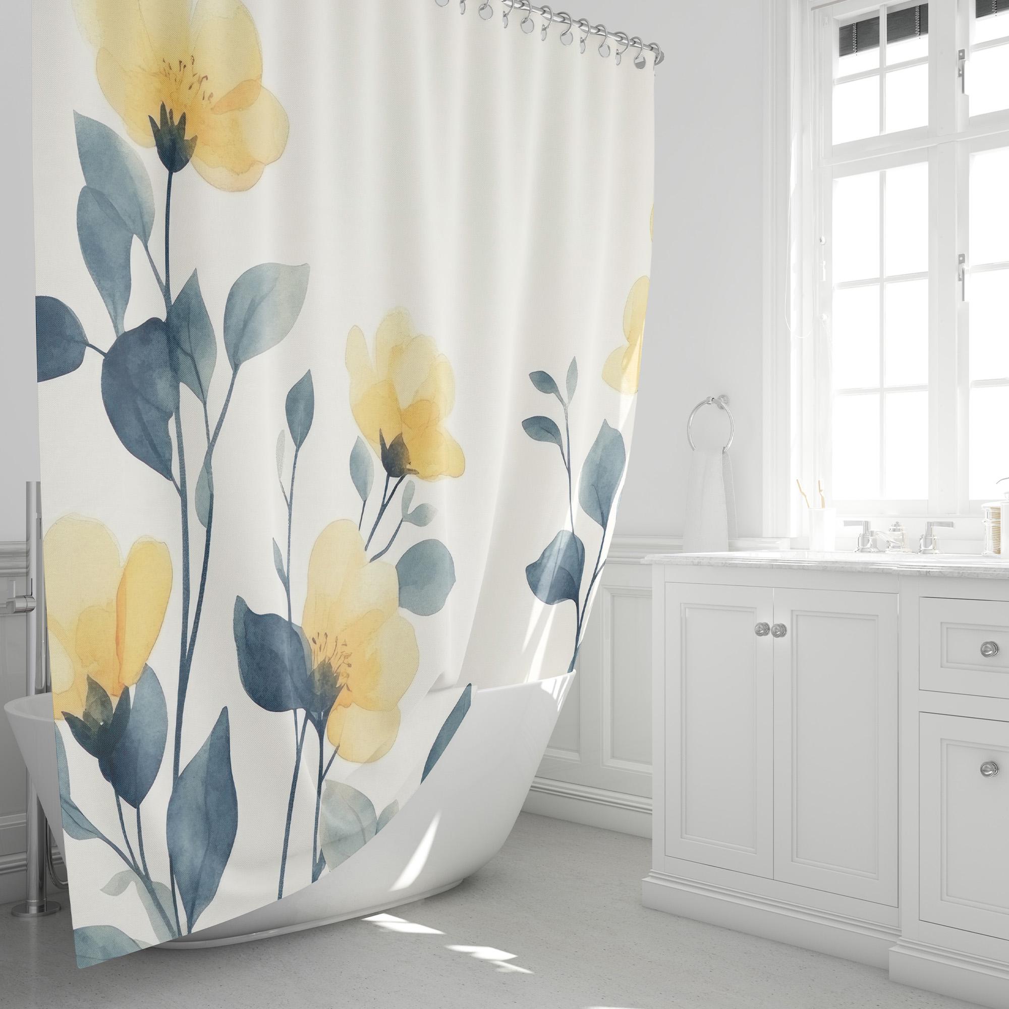 Bovlleetd Gelbe Blumen Duschvorhang Boho Aquarell Blüte Blume Blätter Botanische Duschvorhang Für Badezimmer Wildblume Pflanze Print Duschvorhang (Gelb Grau) 175x178cm