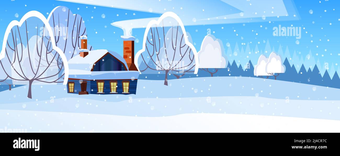 Winterlandschaft Mit Hütte Und Bäumen Vektorgrafik. Verschneite Landschaft. Landhaus-Konzept. Für Websites, Hintergrundbilder, Poster Oder Banner Stock-Vektorgrafik