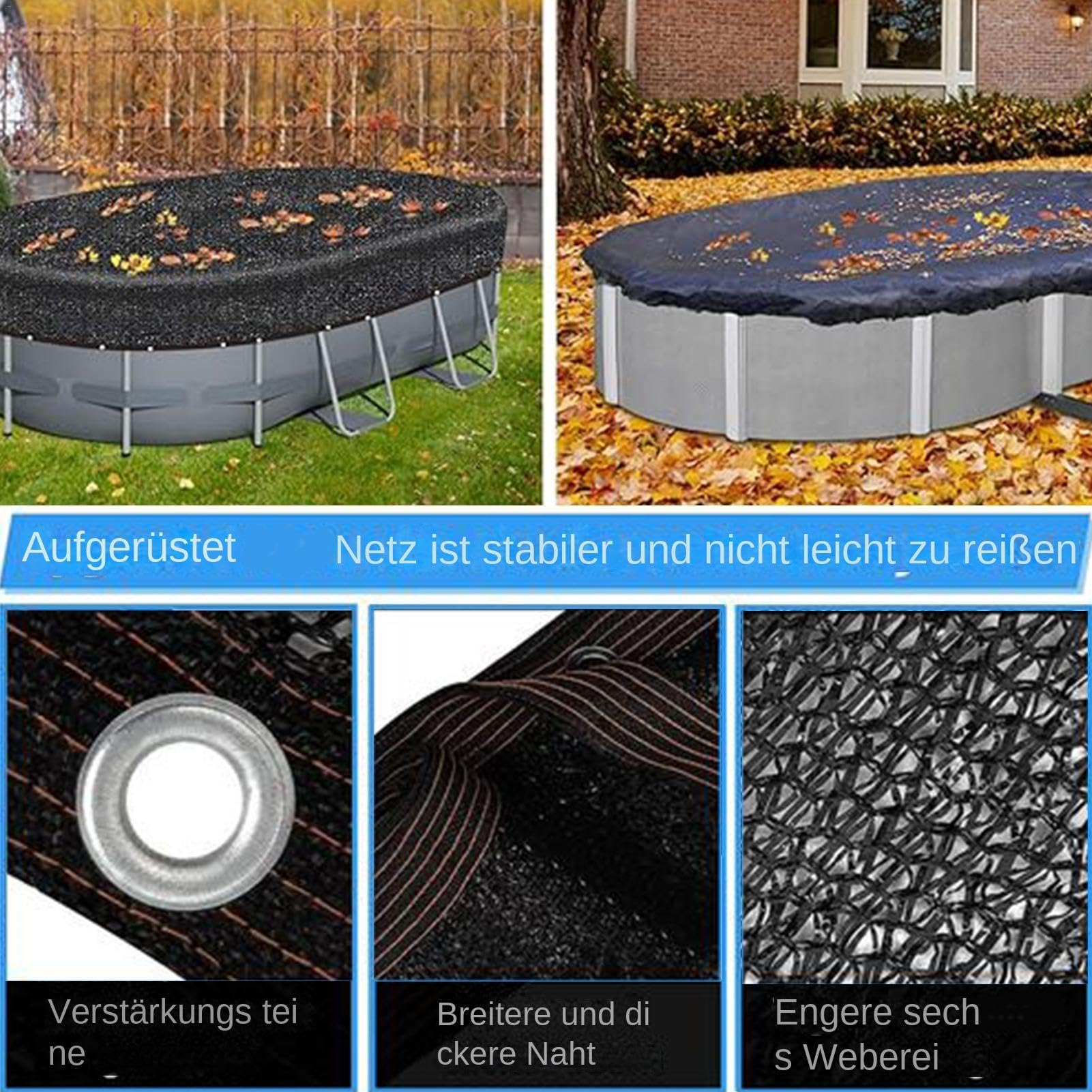 Ausgestattet mit einem Stahlkernkabel, das nahtlos in verstärkte Ösen passt, sorgen diese Poolabdeckungen für einen festen und sicheren Sitz und lassen keinen Platz für Schmutz eindringen. Lieferumfang: 1 x Poolabdeckung, 1 x winddichtes und festes Zubehör: Seilwinde und Kabelsatz, 1 x Montageanleitung (evtl. Das überauffällige Stahlseil hält Ihre Abdeckung auch bei extremem Wetter stabil. MCW Pool-Abdeckung 200 µm Rechteckig 10x5m Blau kaufen bei Sie erhalten eine spezifische Montageanleitung im Paket. Bitte überprüfen Sie Ihre Poolgröße vor dem Kauf., Warnhinweise Allgemeine Sicherheitshinweise: Super dickes und reißfestes Material speziell für den Winter: Diese verbesserte Pool-Winterabdeckung ist aus dichtem Polyethylen (PE) mit einer Dichte von 18 x 18 und einer Dichte von 190 g/m² gefertigt. Die mitgelieferte speziell geformte Seilwinde ermöglicht einen reibungslosen Betrieb, wodurch das Kabel mühelos festgezogen werden kann und eine problemlose Installation gewährleistet wird Kältebeständig und UV-beständig: Diese oberirdische Poolabdeckung ist oval, um langen und kalten Winter, Schnee und Freezwetter zu überstehen. Unter normalen Umständen müssen die Flecken auf der Abdeckung nur sanft mit einem feuchten Tuch abgewischt werden, dann wie neu abdecken Einfach zu installieren: Die ovalen Poolabdeckungen für oberirdische Pools sind für eine mühelose Einrichtung konzipiert. Diese zusätzliche 1,2 m erweiterte Überlappung stellt sicher, dass die Abdeckung den Pool vollständig abdeckt. Wasserdicht und staubdicht für alle Jahreszeiten: Unsere Schwimmbadabdeckung ist aus 100 % wasserdichtem Material. wie: Taifune, Sturm, Schnee, windige Tage Die reinen Ösen am Umfang der Poolabdeckung sind aus robustem Aluminium und verformt sich nicht beim Ziehen der Seilwinde. und die Dicke der Abdeckung beträgt 0,56 mm. Produktbeschreibungen Diese ovale/rechteckige Poolabdeckung ist 6,1 x 8,8 m groß und passt für Poolgrößen bis zu 4,9 x 7,6 m. Diese Poolabdeckung kann mit einer Wasserleitung gewaschen werden. Poolüberdachung Oval Poolabdeckungen & -unterlagen - Living Rechteckige Poolabdeckung 1200x600 Cm Pe Blau 86457054 Poolabdeckung Oval 488x305 Maße: Diese ovale/rechteckige Poolabdeckung ist 6,1 m x 8,8 m, universell passend für oberirdische Poolgrößen bis zu 4,9 m x 7,6 m. Diese Poolabdeckung eignet sich für oberirdische Rahmen/Stahlwand-Schwimmbecken. Premium 5 cm Nylon-Gurtband sorgt dafür, dass der Rand der festen Abdeckung fester ist und nicht leicht zu reißen ist. Verbesserter stabiler Schutz für extremes Wetter: Unser Seilwinde und Seil-Set ist stabiler als andere, unsere Seilwinde verwendet eine höhere Festigkeit Zinklegierung, hält größeren Spannungen stand.